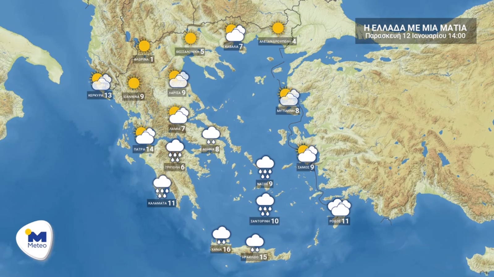 Στις Κυκλάδες και την Κρήτη νεφώσεις με ασθενείς τοπικές βροχές και στα ορεινά της Κρήτης ασθενείς χιονοπτώσεις που το μεσημέρι θα σταματήσουν. Στη δυτική Ελλάδα λίγες νεφώσεις που βαθμιαία θα αυξηθούν και το βράδυ στο βόρειο Ιόνιο θα σημειωθούν τοπικές βροχές. Στην υπόλοιπη χώρα σχεδόν αίθριος καιρός.