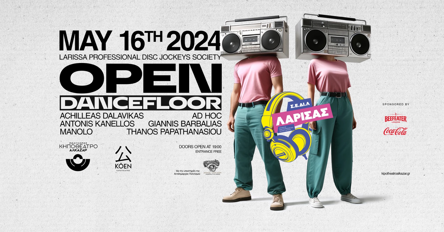 Ο Σύλλογος Επαγγελματιών Δισκοθετών -DJs- Λάρισας (Σ.Ε.ΔΙ.Λ.) υποδέχεται το φετινό καλοκαίρι την Πέμπτη 16 Μαΐου, διοργανώνοντας σε συνεργασία με την Αντιδημαρχία Πολιτισμού Λάρισας στον πολυχώρο του Κηποθεάτρου Αλκαζάρ, το OPEN DANCEFLOOR, υποσχόμενος ένα άκρως χορευτικό 6ωρο μουσικό πρόγραμμα/setlist.