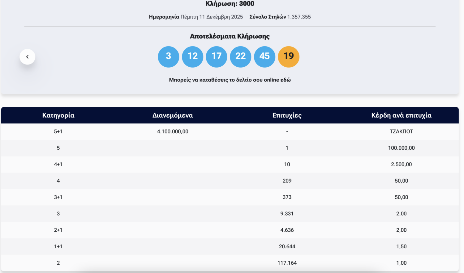 €4.500.000 τουλάχιστον θα μοιραστούν οι τυχεροί της 1ης κατηγορίας στην επόμενη κλήρωση της ΚΥΡΙΑΚΗΣ 14/12/2025 μετά το ΤΖΑΚ-ΠΟΤ που σημειώθηκε κατά τη σημερινή διαλογή της 3000ης κλήρωσης του ΤΖΟΚΕΡ.